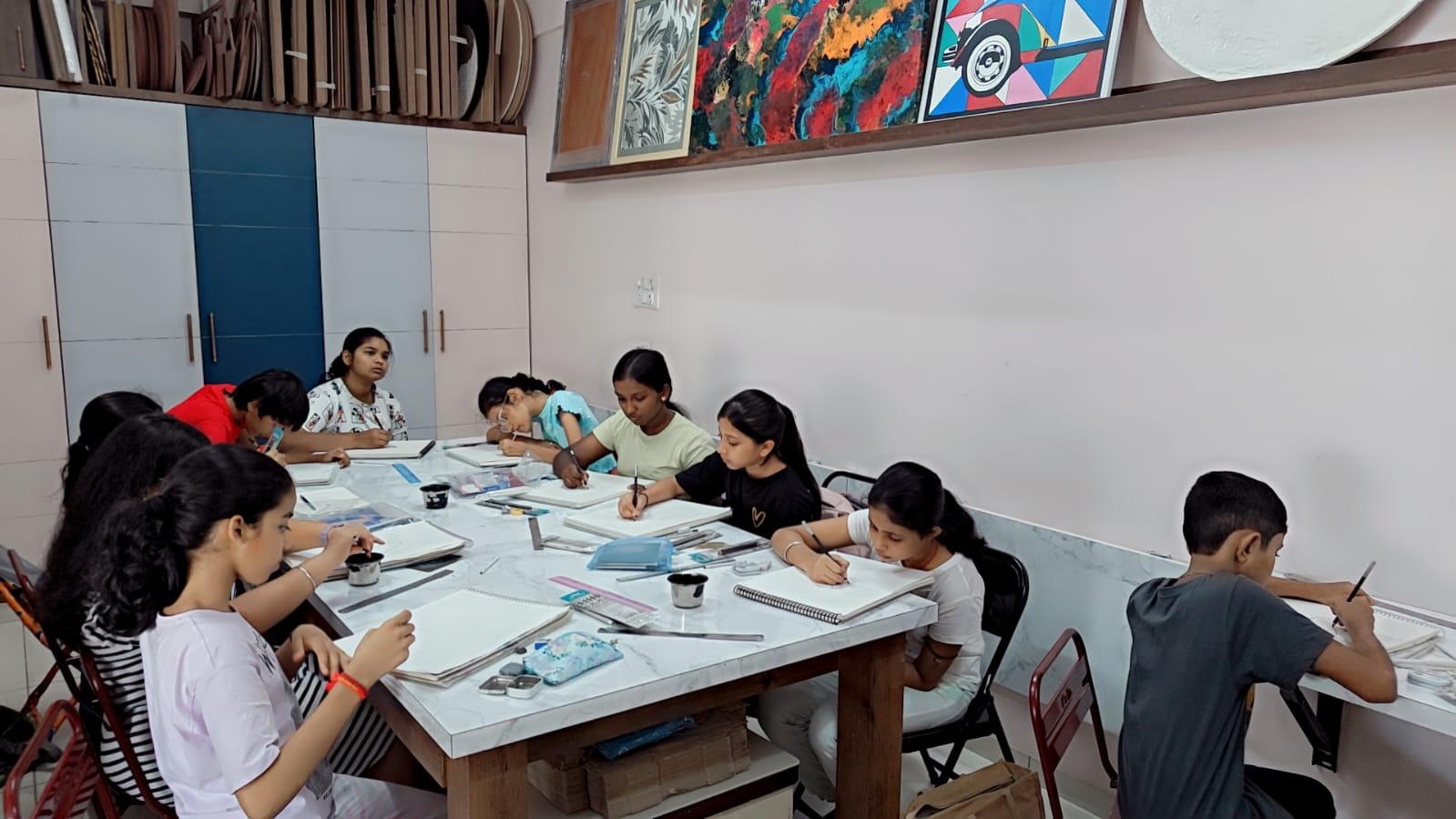 Students should bring basic art materials such as drawing book/sketchbook, pencils, eraser, sharpener, oil pastel colors, watercolor set, drawing brushes, shading tools, graphic pencils, and charcoal. Detailed material guidance will also be provided during the classes.
